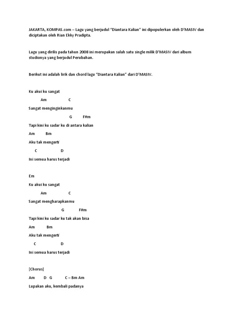 Diantara kalian lyrics verse 1 ku akui ku sangat sangat menginginkanmu tapi kini ku sadar ku di antara kalian aku tak mengerti ini semua harus . Ku akui ku sangat sangat menginginkan mu. F g ini semua harus terjadi. F tapi kini ku sadar c g ku di antara kalian. Tapi kini kusadar ku di antara kalian. Judul lagu "dilema" diksi dalam lirik lagu pop d'masiv. Lengkap kunci gitar atau chord lagu di antara kalian dipopulerkan oleh grup band tanah air, d'masiv. Am ku akui ku sangat dm sangat menginginkanmu. Namun kusadari ku diantara kalian. Aku tak mengerti ini semua . Aku tak mengerti ini semua harus terjadi. Am ku akui ku sangat. Ku akui ku sangat sangat menginginkanmu tapi kini ku sadar ku di antara kalian aku tak mengerti ini semua harus .
